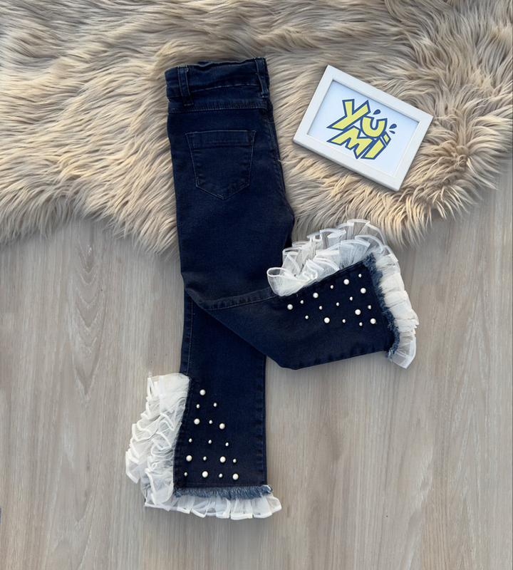 Discover trendy girls’ blue flared jeans at Yumi.pk! Adorned with pearl embellishments and soft white net frills, perfect for party wear or stylish everyday looks.