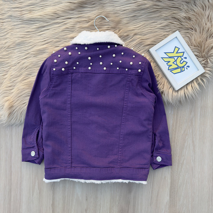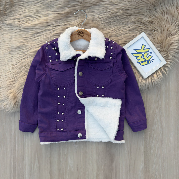 Cozy girls’ purple denim jacket with soft sherpa fur lining and stud details—perfect for winter. COD & fast shipping across Pakistan.