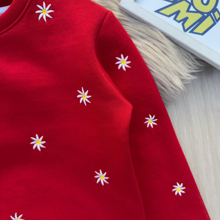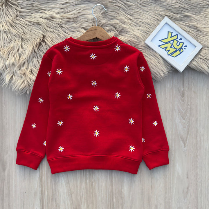 Girls Red Embroidered Sweatshirt – All Over Daisy Stitch Design